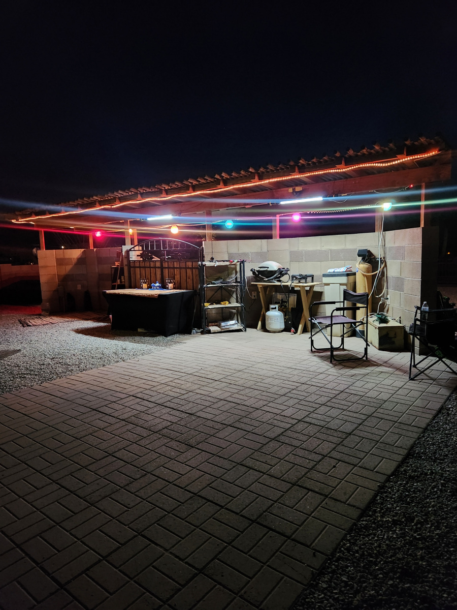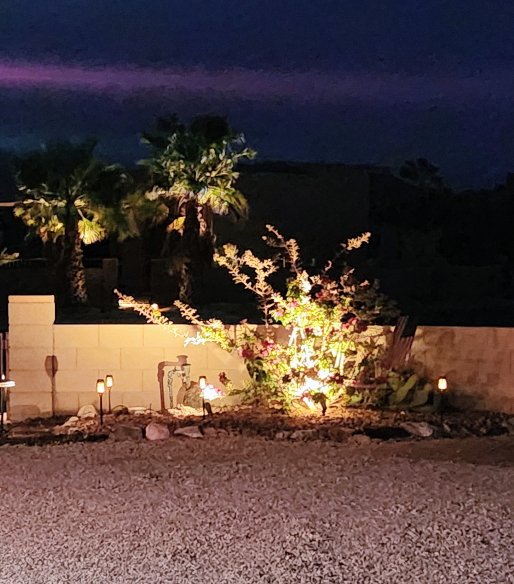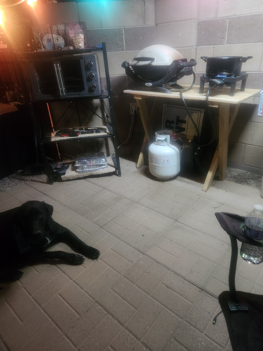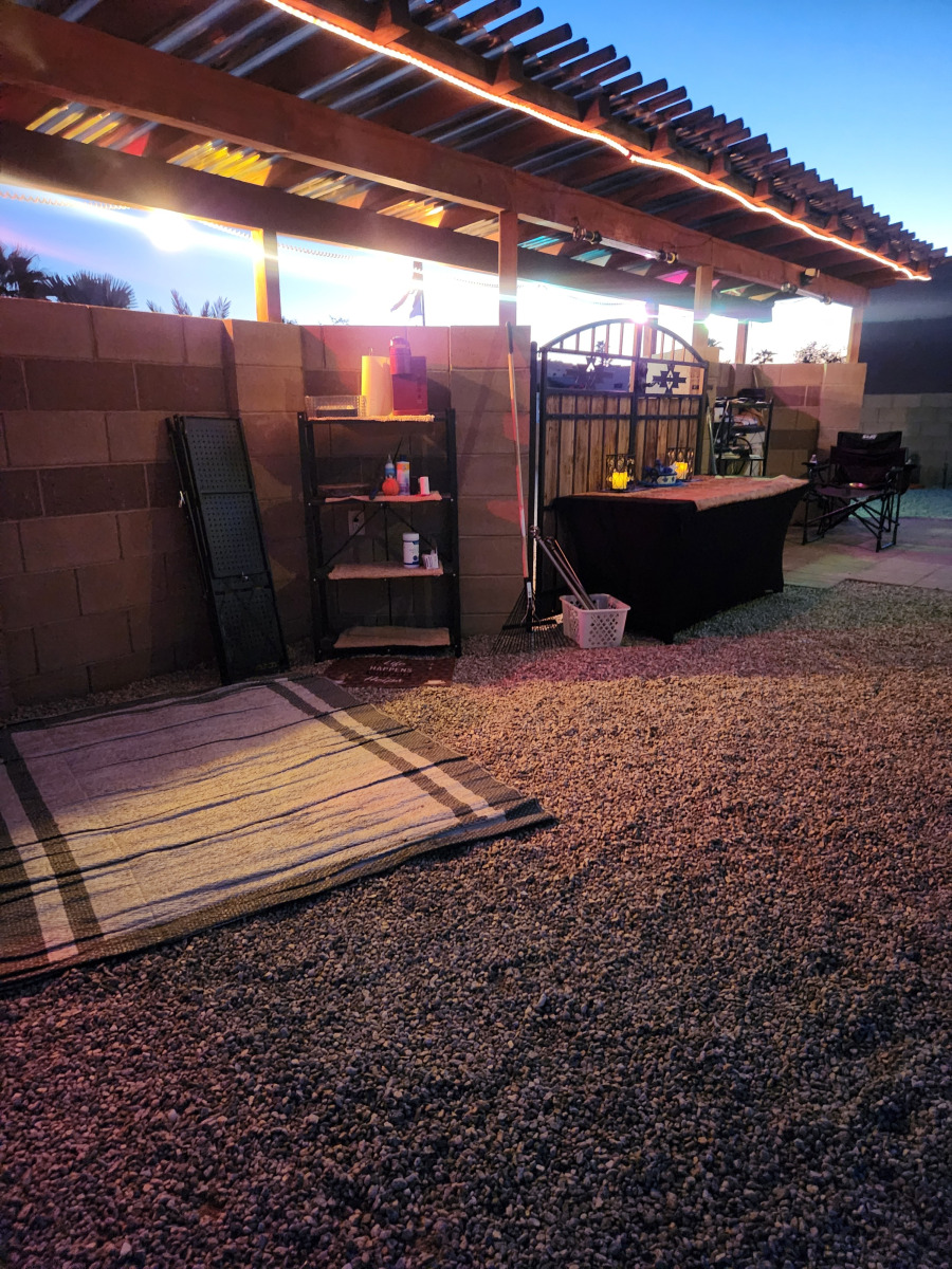We quickly settled into our beautiful lot in the Foothills of Yuma, Arizona. The desert landscape, large fenced lot, and partial outdoor casita—used daily—are big pluses for us. Bill loves BBQing and using the smoker outside, which essentially gives us an additional outdoor kitchen. We move our chairs around and enjoy watching TV outside on our RV setup.